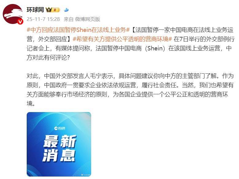 据环球网报道:在7日举行的外交部例行记者会上,有媒体提问称,法国暂停中国电商(Shein)在该国线上业务运营,中方对此有何评论?