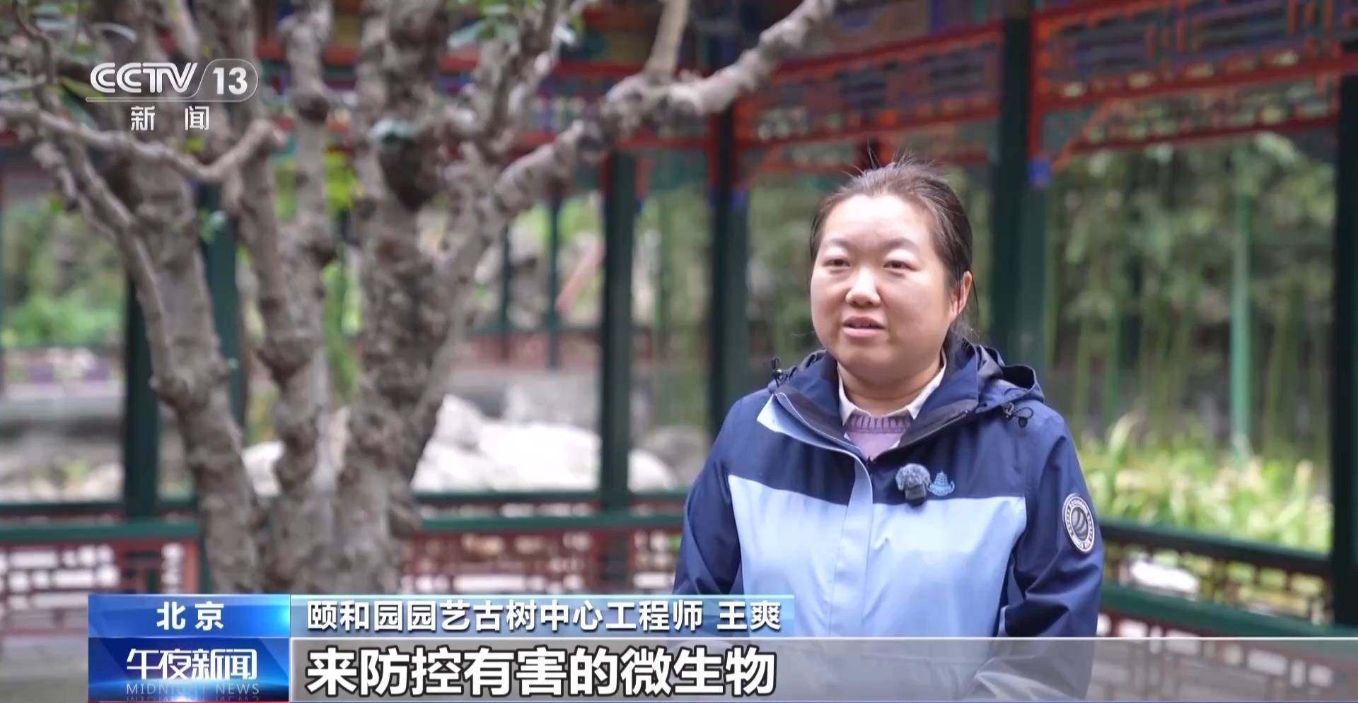 颐和园园艺古树中心工程师 王爽:我们在海棠上应用的主要是“以菌治菌”,就是以用有益的微生物来防控有害的微生物,一方面减少化学农药的使用,另一方面它对环境的兼容性和友好性相对好一些。颐和园的海棠因为造型的需要,还有跟古建关系的需要,需要经常修剪,伤口的增加也会带来腐烂病的发生和流行,所以我们特别在颐和园的海棠上应用了这项技术,目前取得了比较好的防治效果。